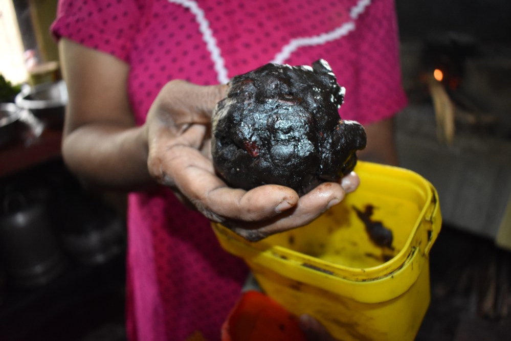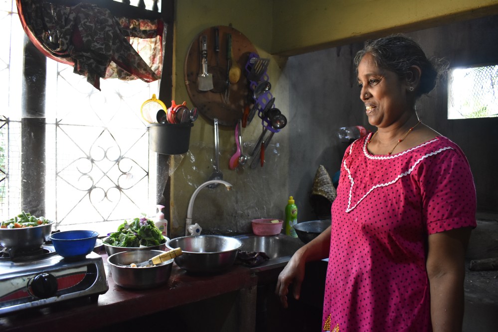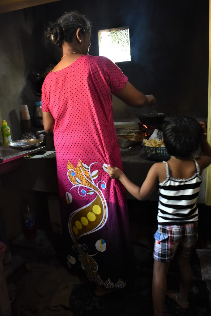 It’s been an exciting journey to get here, sitting on the back of her nephew’s scooter we toot and weave our way through the busy roads of Jaffna town, past the grand golden Nallur temple and into the paddy-field-lined outskirts. By the time we reach Vasanthy’s, the temples have become shabbier, rickety bicycles have replaced honking tuk-tuks and jungle is battling to recapture any free space. Vasanthy has recently moved into the house, which she shares with her daughter and two grand-daughters. Before that they were renting as their old family home was bombed during the Civil War. Both Vasanthy and her daughter’s husbands are noticeable by their absence.