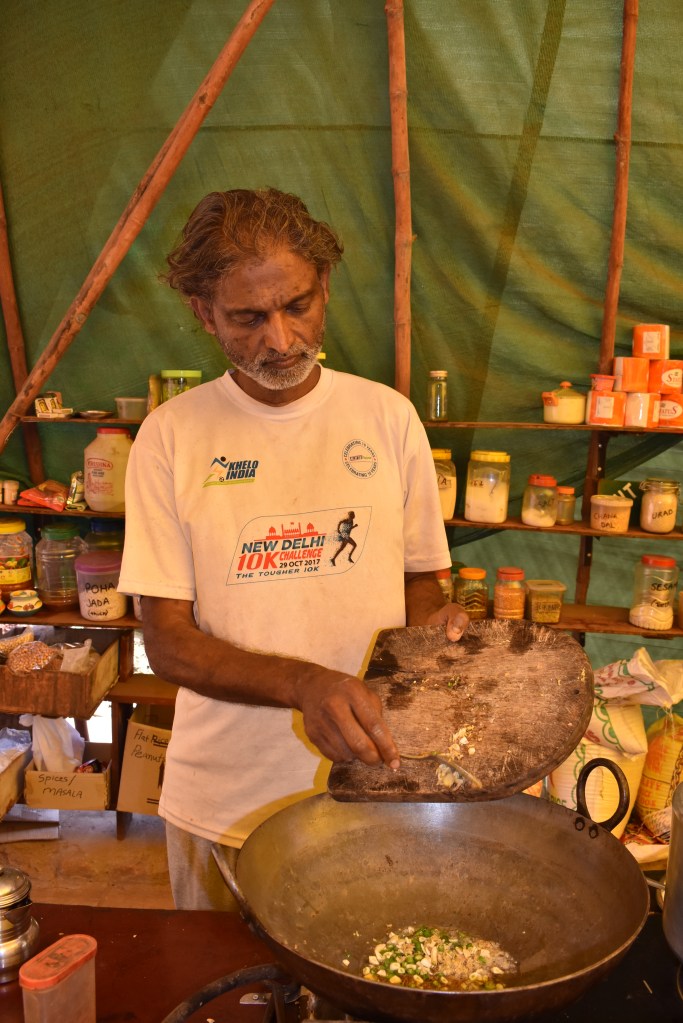 Hasmukh was the king of breakfasts. It was his responsibility to make them at Sapna Ranch and each morning there would be something different – bhelpuri (a type of chaat, made with puffed rice and tangy tamarind sauce), poha jada (thin beaten rice), poha patla (thick beaten rice), upma (savoury porridge made using semolina and vegetables) and ragi (millet porridge). Poha patla is Hasmukh’s favourite “because everything is raw and there’s a good mix of crunch and softness”. It’s a popular breakfast dish all over India, but IMO it would be perfectly acceptable to eat this any time of the day.