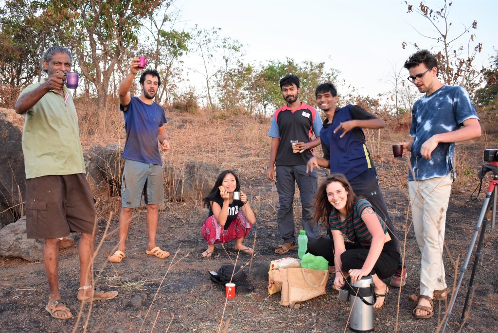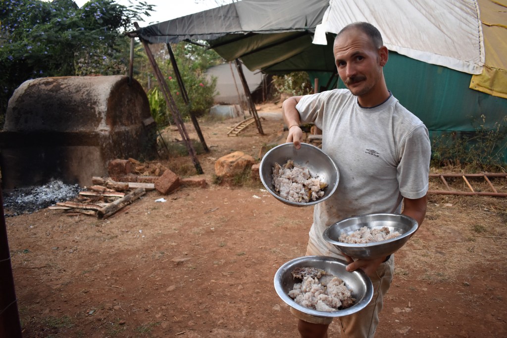 Eventually Hasmukh would cry out across the farm, “Everybody! Breakfast will be ready in ten minutes”. If people weren’t already by now hungrily hovering around the kitchen, then this call would rouse people from their beds or other tasks. The mat would be washed and homemade curd, fruit, hot kada, poha patla, and eventually people would sit around cross-legged to enjoy the first meal of the day. If it tasted good (which it always did), Hasmukh would exclaim over breakfast to whoever helped him cook that morning “it’s come out good [Chloe], now when I come to England, I know I will be able to get poha patla”. This was pretty much how mornings went at Sapna Ranch.