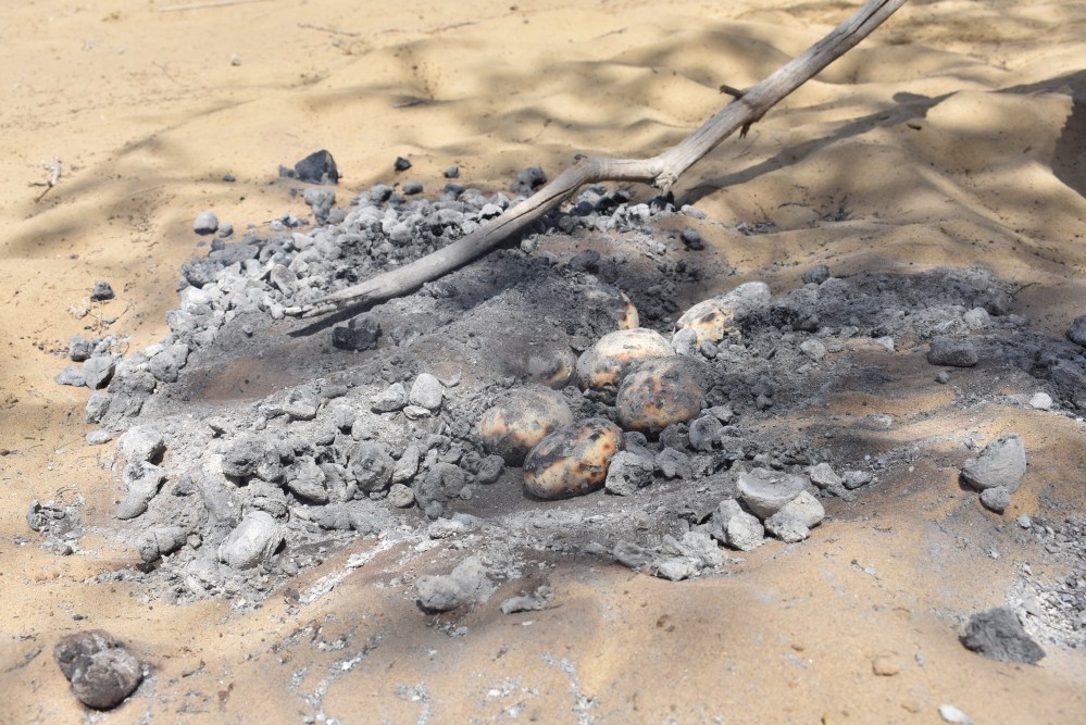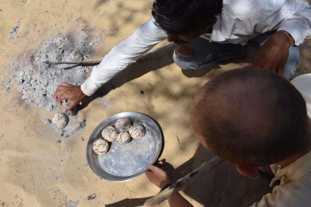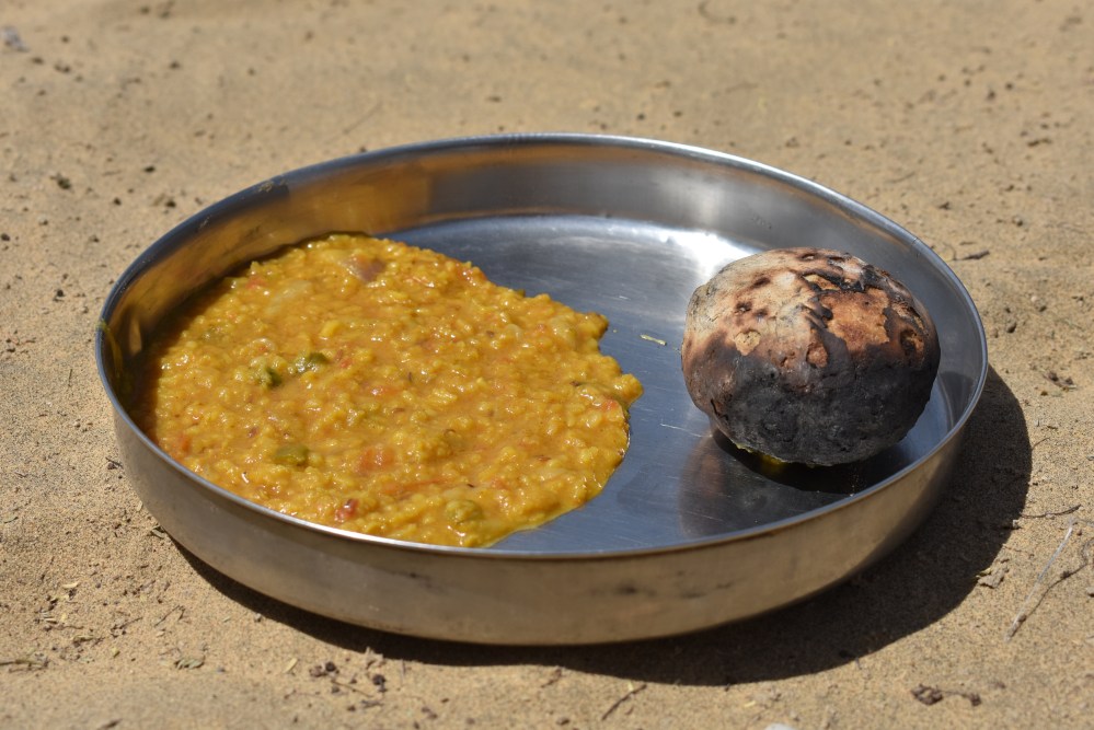 Sandy diligently goes off to collect firewood and great lumps of cow dung for the fire. If you order dal baati at a restaurant I am 99% sure that it won’t have been cooked this way, but ‘proper’ baati has to be cooked in cow dung. Why? I ask Sandy – he has no idea. It just is. Sandy makes a fire using dried wood and the cow dung, after the dung has burned down and become like hot coals, Sandy briefly cooks the dough on top of the coals before burying them in the hot sand underneath. Then we wait for 30 mins whilst the sand and the cow shit work their magic on the heavy mixture of flour plus water.