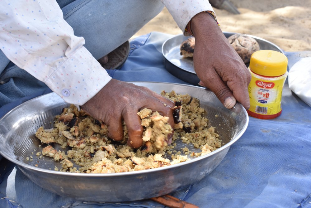 Meanwhile the dal is cooked ferociously over another makeshift fire. When the baati’s are ready Sandy puts a couple aside to have whole, and tears up the rest of them with his hands before pouring in a whole pot of ghee and about 1 kg of sugar. Using both of his hands he squidges the mixture together and I watch as the charred pieces and undercooked dough pass through every inch of his hands, wondering to myself if I remember seeing him wash them beforehand.