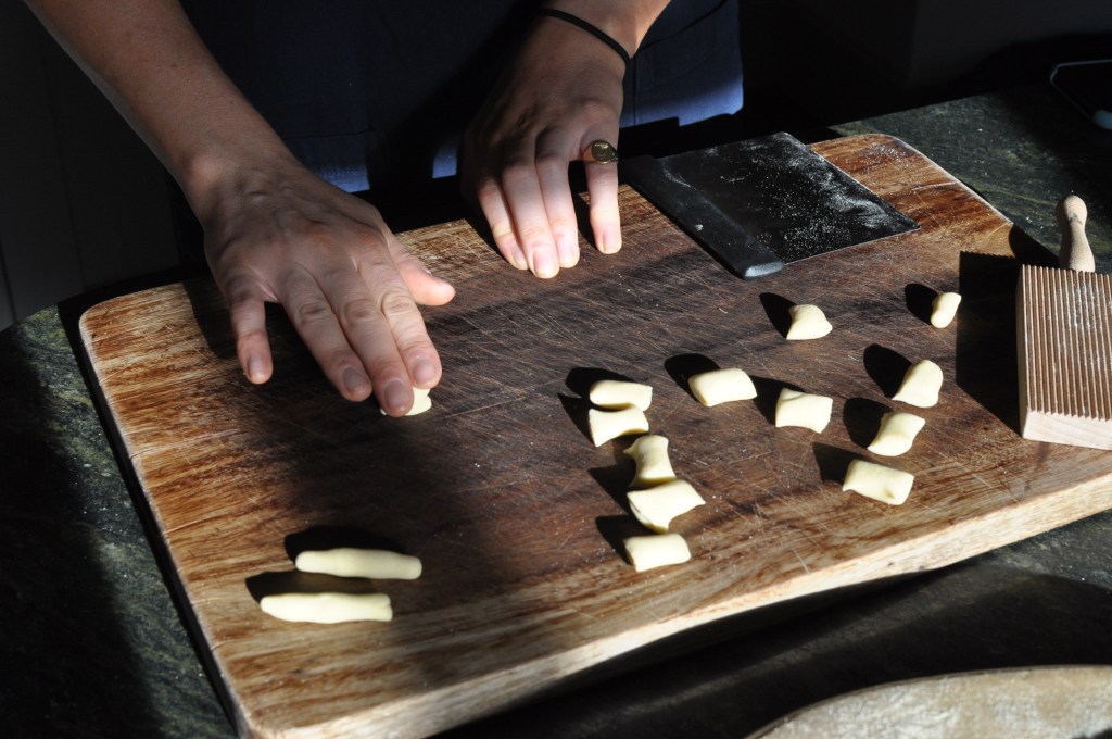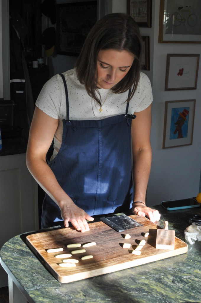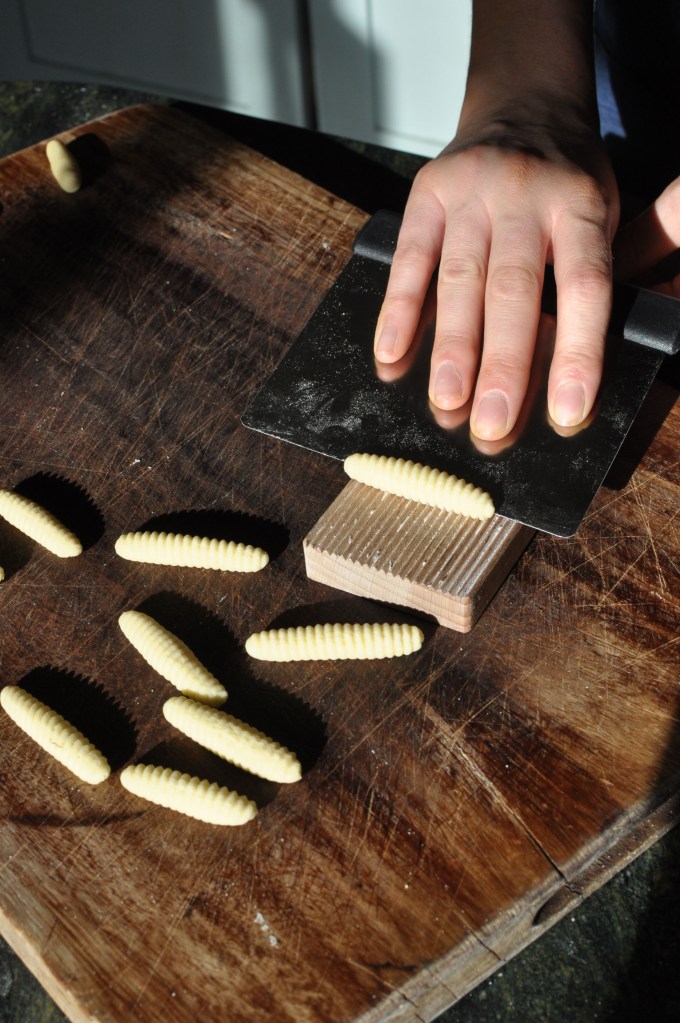 In a large bowl make a well in the centre of the flour and pour in the water. Using a butter knife, mix together the water and the semolina until a shaggy consistency, then use your hands to bring together to a dough. Transfer to a clean surface and knead until smooth and springy- around 8-10 minutes. Cover and rest at room temperature for half an hour. This dough can be used to make a plethora of different pastas- orecchiette, cavatelli, pici, trofie, busiate, maccheroni to name a few. To make Malloreddus it is useful to have a garganelli/ gnocchi board/ butter pat so you can get the ridges, however if you do not have one you can use a fork.