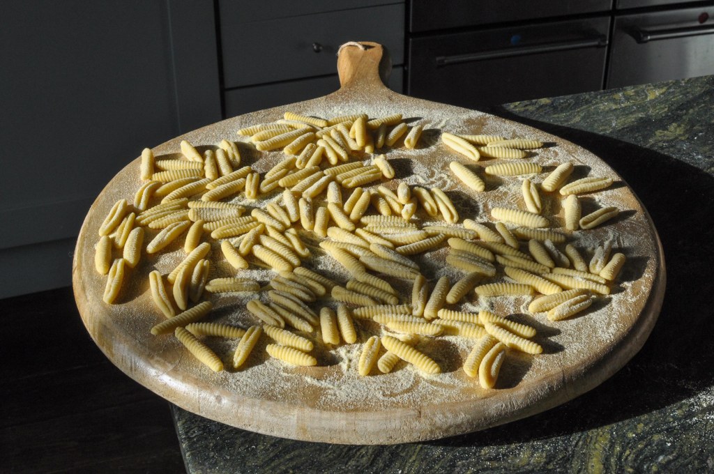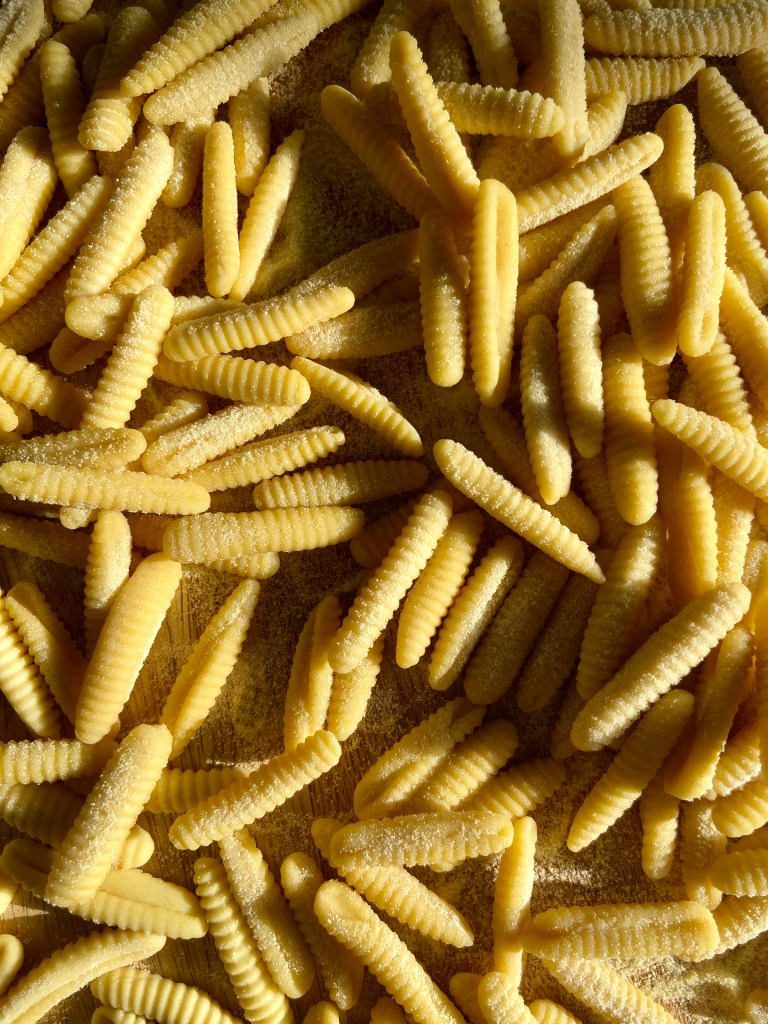 While you are rolling your malloreddus, transfer your rolled pieces to a porous surface- wood ideally, that has been dusted with more semolina. This will help them dry out and prevent them from sticking together. Leave the pasta to dry for at least an hour, ideally 2 or 3 before cooking. They can also dry out overnight and will keep for a couple of days at room temperature.