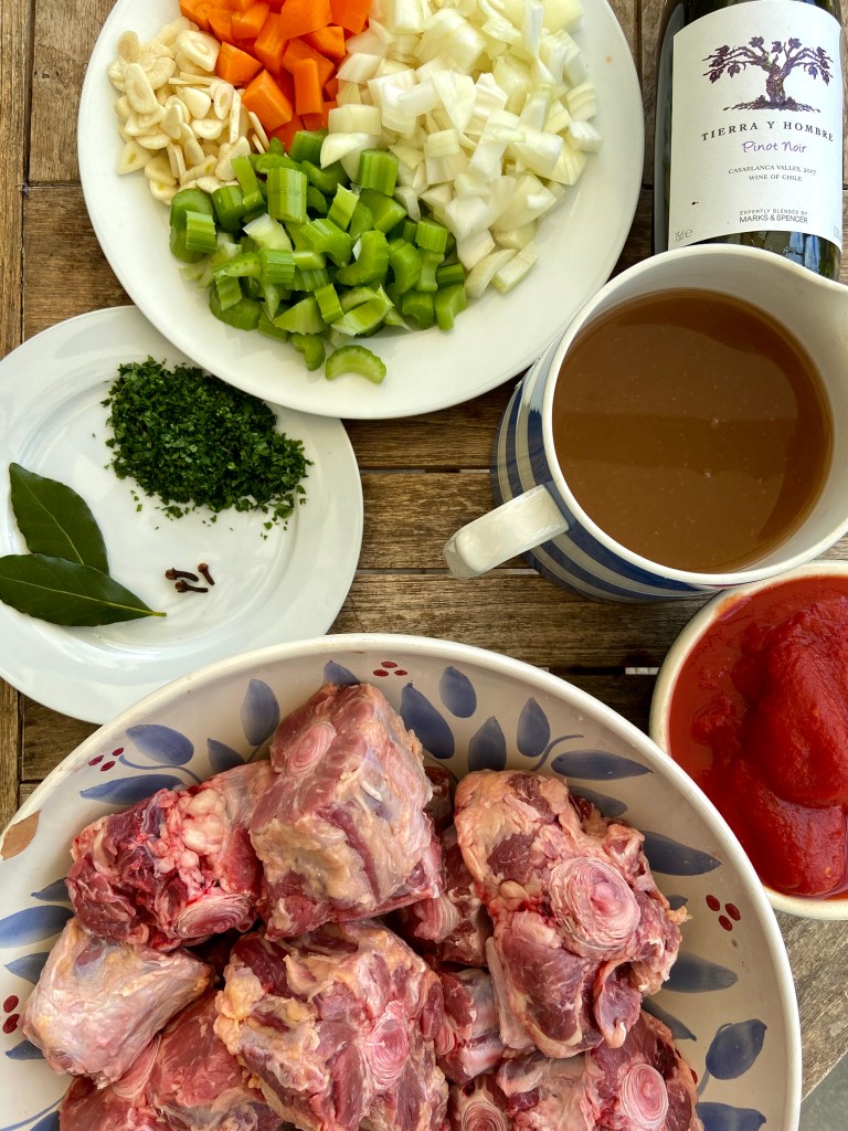 In a large casserole or stock pot on a high heat, add the oil and wait until it is smoking. In batches, seal the pieces of oxtail in the oil, concentrating on good caramelisation on all sides, setting the sealed pieces aside as you go. Once all the pieces are sealed, add the vegetables and garlic into the pan and caramelise in the fat from the beef on a medium heat. This should take around 10/15 minutes. Then add the wine, bring up to a boil and reduce by half. Next stir in the tomatoes, bay, cloves and stock before returning the pieces of oxtail to the pain. Bring up to a simmer, put the lid on and transfer to the oven.