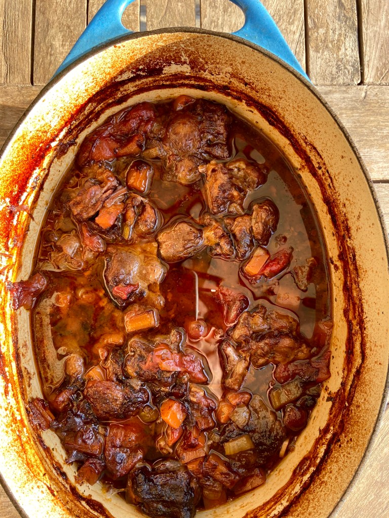 Give the oxtail 4 hours with the lid on, checking after 2 just for safeguarding. After 4 hours, remove the lid and cook for one hour more. These timings don’t have to be exact- the most important thing is that the meat is tender and falling off the bone, and that this result is achieved at a low temperature to ensure ultimate softness and that the more muscly parts of the meat have broken down. So it is important to check your ragu during the process and make sure you’re happy with it. Cooking is sensory and so trust your senses and your instincts!