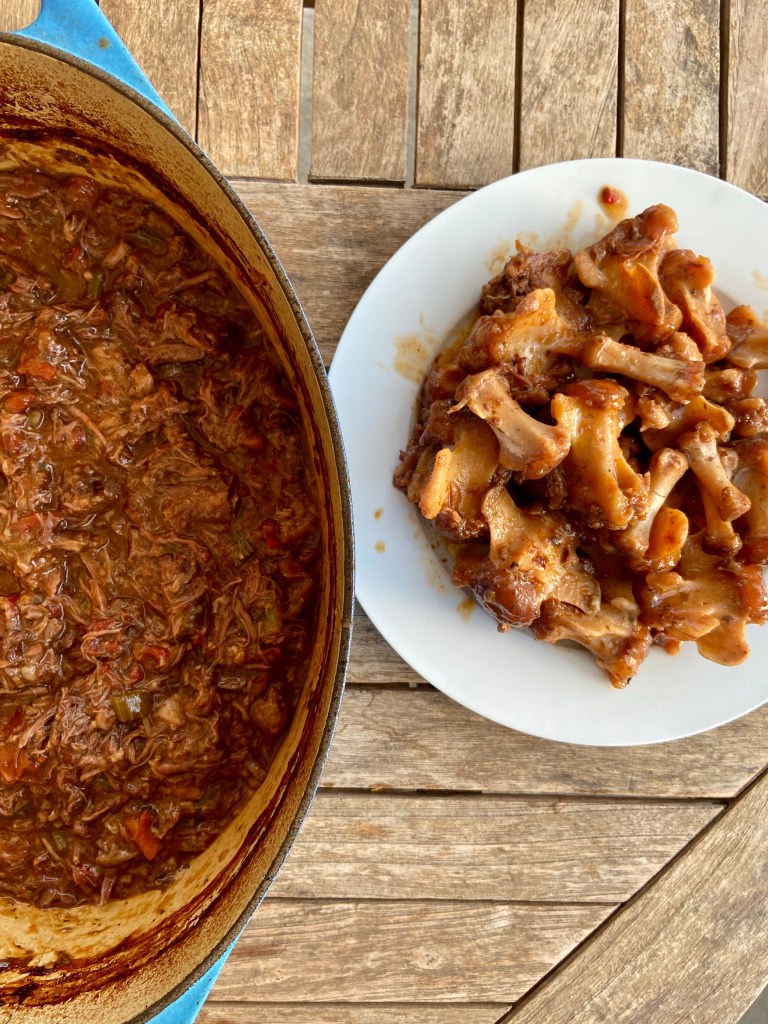 Using a fork and spoon or whatever feels easiest, pull the meat off the bones of the oxtail, removing the bones as you go. This is much easier when the mix is warm. Then concentrate on gently shredding the meat within the sauce and basically mixing it well until all the meat is nicely broken down within it. You may want to remove the bay leaves and cloves during this process too. At this point, check and adjust the seasoning. We didn’t season much early on because during the cooking and reducing of the sauce you can end up with something much saltier than you wished- it is safer to season now. Leave to cool a bit more before covering and transferring to the fridge.